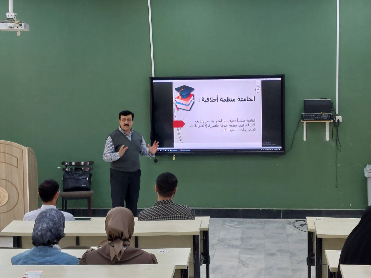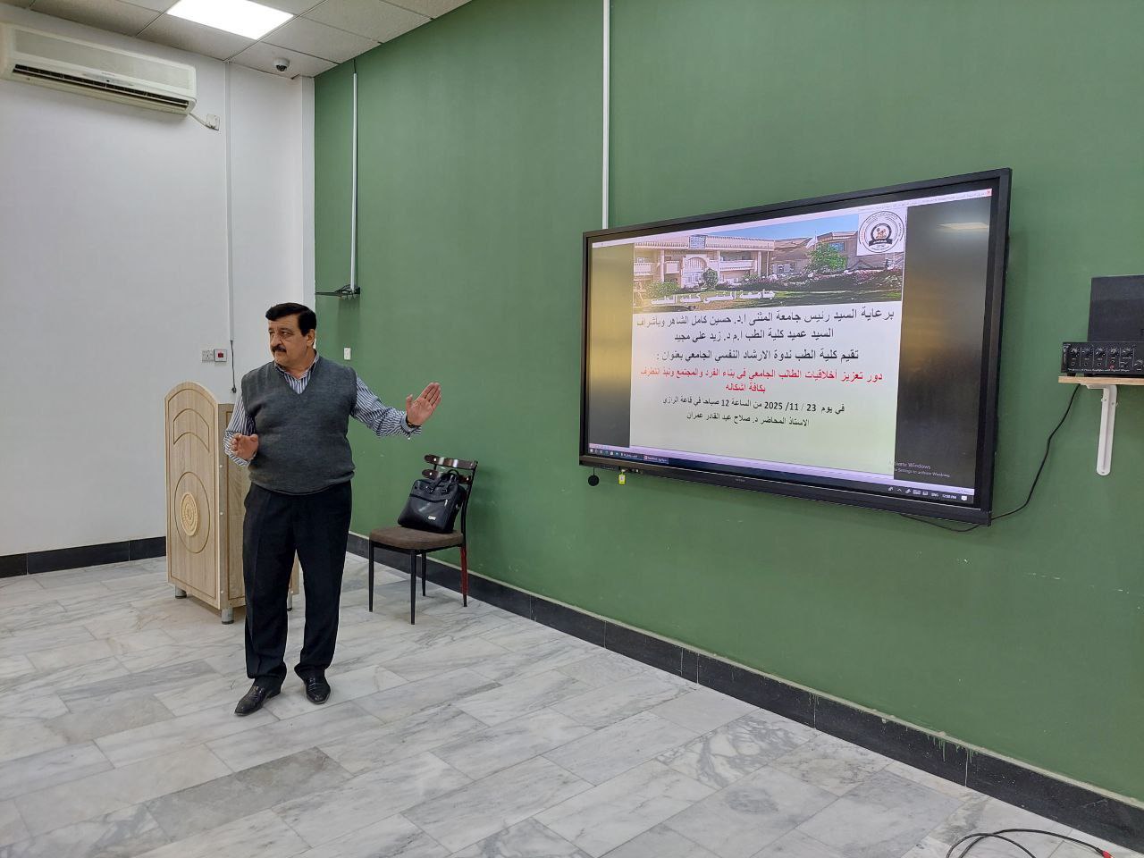 برعــــــاية عميد كلية الطب المحترم أ.م.د زيد علي مجيد أقيمت وحدة الإرشاد النفسي الجامعي ندوة توعوية بعنوان (دور تعزيز اخلاقيات الطالب الجامعي في بناء الفرد والمجتمع ونبذ التطرف بكافة اشكاله) حاضر فيها أ. د. صلاح عبد القادر في بناية المختبرات العلمية لكلية الطب بتأريخ ٢٣/١١/٢٠٢٥ الساعة ١٢:٠٠ ظهراً. تهدف الندوة التوعوية لبناء شخصية مؤهلة علميًا وأخلاقيًا لتكون عضوًا نافعًا ومسؤولًا في المجتمع. وتتمثل هذه الأخلاقيات في الالتزام بقيم الجامعة والأنظمة الأكاديمية، واحترام الأساتذة والزملاء، والأمانة في الدراسة والبحث العلمي، والتعامل مع المجتمع بمسؤولية وكفاءة. تتمثل أخلاقيات الطالب الجامعي في الالتزام بقيم النزاهة والاحترام والمسؤولية، والتحلي بالانضباط السلوكي والأكاديمي داخل وخارج الحرم الجامعي. ويشمل ذلك احترام الأنظمة والقوانين الجامعية، والتعامل بإيجابية مع الزملاء والأساتذة، والمحافظة على ممتلكات الجامعة، بالإضافة إلى الحفاظ على السمعة الحسنة للجامعة.