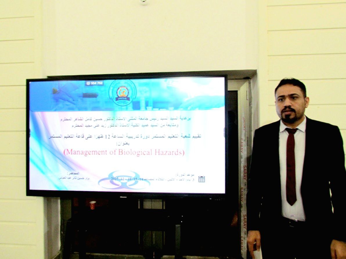 برعاية السيد رئيس جامعة المثنى المحترم الأستاذ الدكتور حسين كامل الشاهر، وبإشراف السيد عميد كلية الطب المحترم الأستاذ المساعد الدكتور زيد علي مجيد، نظّمت شعبة التعليم المستمر في كلية الطب دورة تدريبية بعنوان< Management of Biological Hazards> واستمرت لمدة ثلاثة ايام ( الاحد,الاثنين , الثلاثاء...